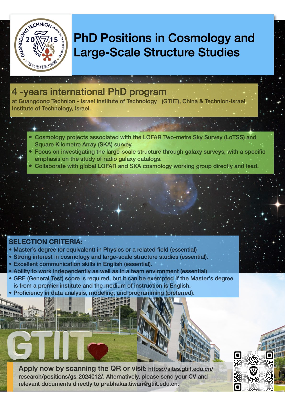 | Job Title: PhD Position in Cosmology and Large-Scale Structure Studies (GS-2024012) Job Category(s) : PhD Job Description : Description The Physics Program (group of Prabhakar Tiwari) is looking for 1 PhD student to conduct research in cosmology and large-scale structure studies. Contract duration: 3 + 1 years. Project Details The Ph.D. students will primarily focus on investigating the large-scale structure through galaxy surveys, with a specific emphasis on the study of radio galaxy catalogs. Students will have the opportunity to collaborate directly with the LOFAR Cosmology Group and lead projects in the field of cosmological exploration using the upcoming data release from the LOFAR Two-metre Sky Survey (LoTSS). This offers a unique opportunity for students to actively engage in cutting-edge research with the support of leading experts in the field. Additionally, these positions offer active involvement in cosmology projects associated with the Square Kilometre Array (SKA) survey, allowing students to contribute to ground-breaking cosmological discoveries. These positions provide an exciting opportunity to be part of a vibrant research community, collaborate with world-class researchers, and play a significant role in advancing our understanding of the cosmos. Keywords Cosmology, large-scale structure of universe, cosmological principle, cosmology: observations, cosmology: theory, cosmological parameters, radio continuum: galaxies, galaxies: active, galaxies: statistics, galaxies: high-redshift, radio continuum surveys, radio catalogs. Selection Criteria Master’s degree (or equivalent) in Physics or or a related field (essential) Strong interest in cosmology and large-scale structure studies (essential). Proficiency in data analysis, modeling, and programming (preferred). Excellent communication skills in English (essential). Ability to work independently as well as in a team environment (essential) Ability to author scientific reports and co-author scientific publications (essential) The PhD candidate must fulfill the requirements for admission to the Technion Graduate School and needs to comply with its regulations leading to the PhD degree: https://graduate.technion.ac.il/en/prospective-students/ Application Application deadline: ASAP Send required documents electronically to: prabhakar.tiwari@gtiit.edu.cn Contact Assoc. Prof. Prabhakar Tiwari Phone: +86 (754) 8807 7203 Email: prabhakar.tiwari@gtiit.edu.cn Web Page : https://www.gtiit.edu.cn/en/viewStaff.aspx?staffNo=275 Department Website: https://sites.gtiit.edu.cn/physicsprogram/ Application deadline : 2025-03-31 Institutional URL with the announcement : https://sites.gtiit.edu.cn/research/positions/gs-2024012/ Announcement Brochure/Poster/Notification : PhD_poster.1.jpeg Name of the Contact Person : Prabhakar Tiwari Affiliation of the Contact Person : N/A Email of the Contact Person : prabhakar.tiwari@gtiit.edu.cn Other Remarks : N/A |