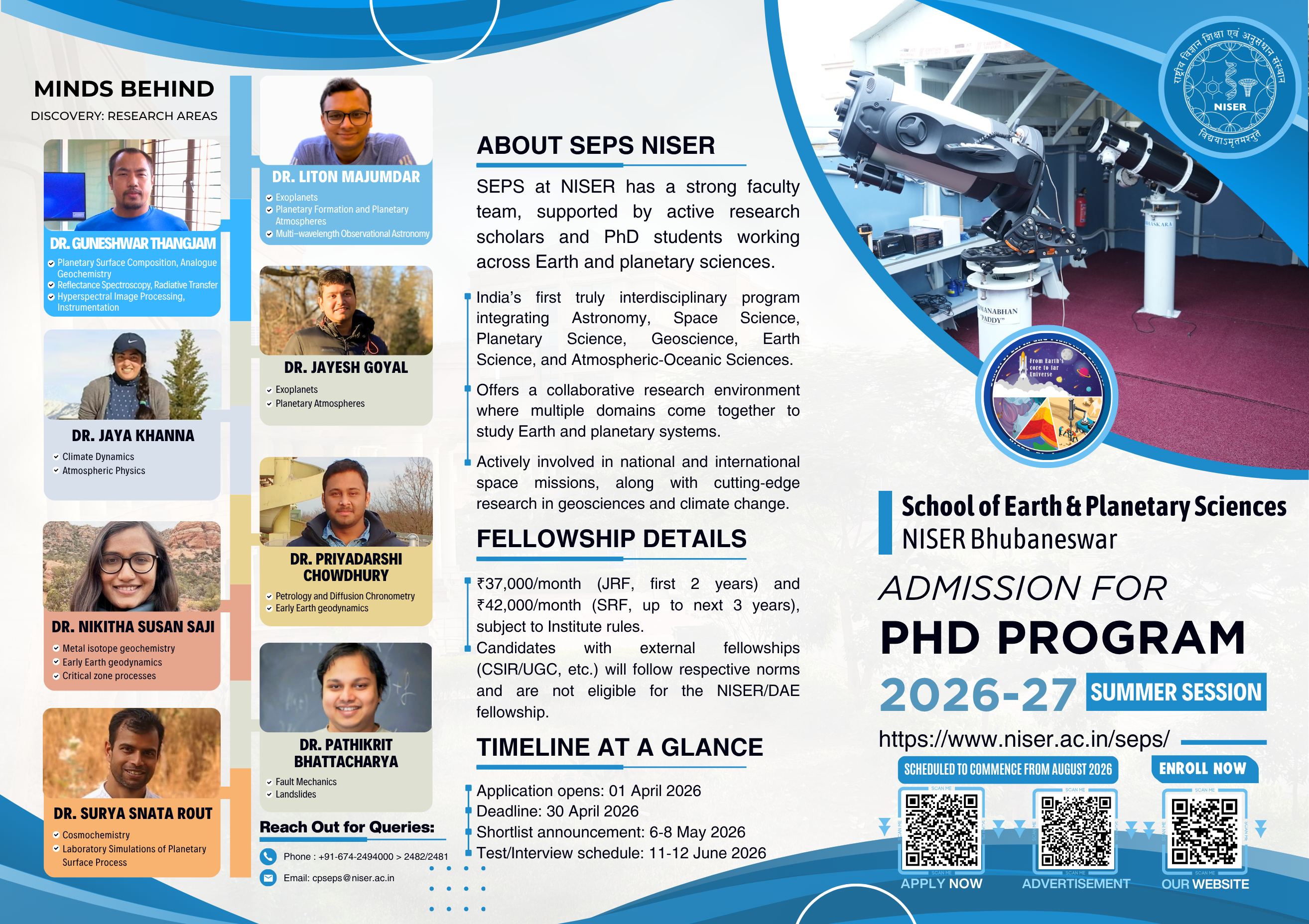 | Job Title: PhD Opportunities in the Areas of Astronomy, Space, and Planetary Sciences at SEPS, NISER Bhubaneswar Job Category(s) : PhD Job Description : From Earth to space, we study it all! Join our interdisciplinary research group at National Institute of Science Education and Research, where astrophysicists, planetary, Earth, and atmospheric–oceanic scientists unite to explore nature in all its forms. 👉 PhD Opportunities at the School of Earth and Planetary Sciences (SEPS), NISER Bhubaneswar Explore the Cosmos. Decode Earth. Shape the Future. Are we alone in the universe? Do Earth-like worlds orbit distant stars? What secrets does our own planet still hold? At the School of Earth and Planetary Sciences (SEPS), NISER Bhubaneswar, we invite curious, driven, and fearless minds to tackle these profound questions. SEPS is a dynamic, interdisciplinary hub where astrophysicists, planetary scientists, Earth scientists, and space explorers unite to push the boundaries of knowledge, from the deep core of our planet to the farthest exoplanets in the galaxy. What We Explore: a) Exoplanet Detection and Atmospheric Characterization b) Star and Planet Formation, Astrochemistry and Astrobiology c) Planetary Surface and Interior Processes d) Atmospheric Physics and Climate Studies (Earth and Beyond) e) Experimental Cosmochemistry and Laboratory Astrophysics f) Data-driven Discovery using Machine Learning g) Earth System Sciences, Geophysics, Geodynamics, Geochemistry, and more Whether you are an observer, theorist, experimentalist, or data scientist, SEPS offers a vibrant, collaborative ecosystem that brings together in-house faculty, international visiting faculty, and world-class researchers through strong visiting programs, all designed to nurture your ideas, sharpen your skills, and empower you to contribute to frontier research areas linked to major national and international missions. Applications are now open for PhD positions. Come be part of a new generation of scientists solving the mysteries of our planet and the universe beyond. See the flyer for details on the application process. Application deadline : 2026-04-30 Institutional URL with the announcement : https://www.niser.ac.in/storage/notices/2026/academic/PhD_Advertisement_2026-2027_Summer.pdf Announcement Brochure/Poster/Notification : SEPS PhD 2026-27_Summer Session_Revised.png Name of the Contact Person : Dr. Liton Majumdar Affiliation of the Contact Person : NISER Bhubaneswar Email of the Contact Person : liton@niser.ac.in Other Remarks : N/A |