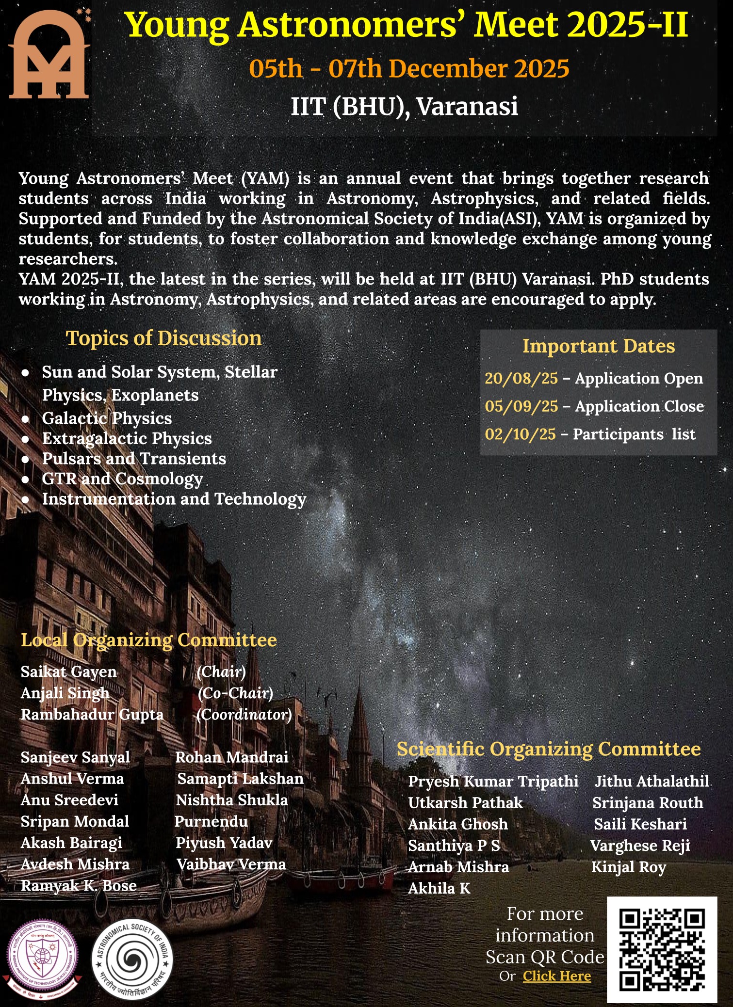 We are delighted to announce the Young Astronomers' Meet 2025-II (YAM-2025-II) hosted by Indian Institute of Technology (BHU), Varanasi. The conference will take place from December 5th to 7th, 2025.