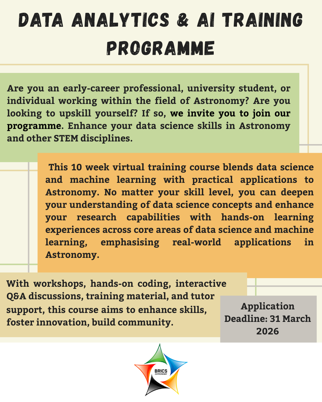 BRICS Astronomy is pleased to announce the Call for Applications for the Data Analytics & AI Training Programme.
